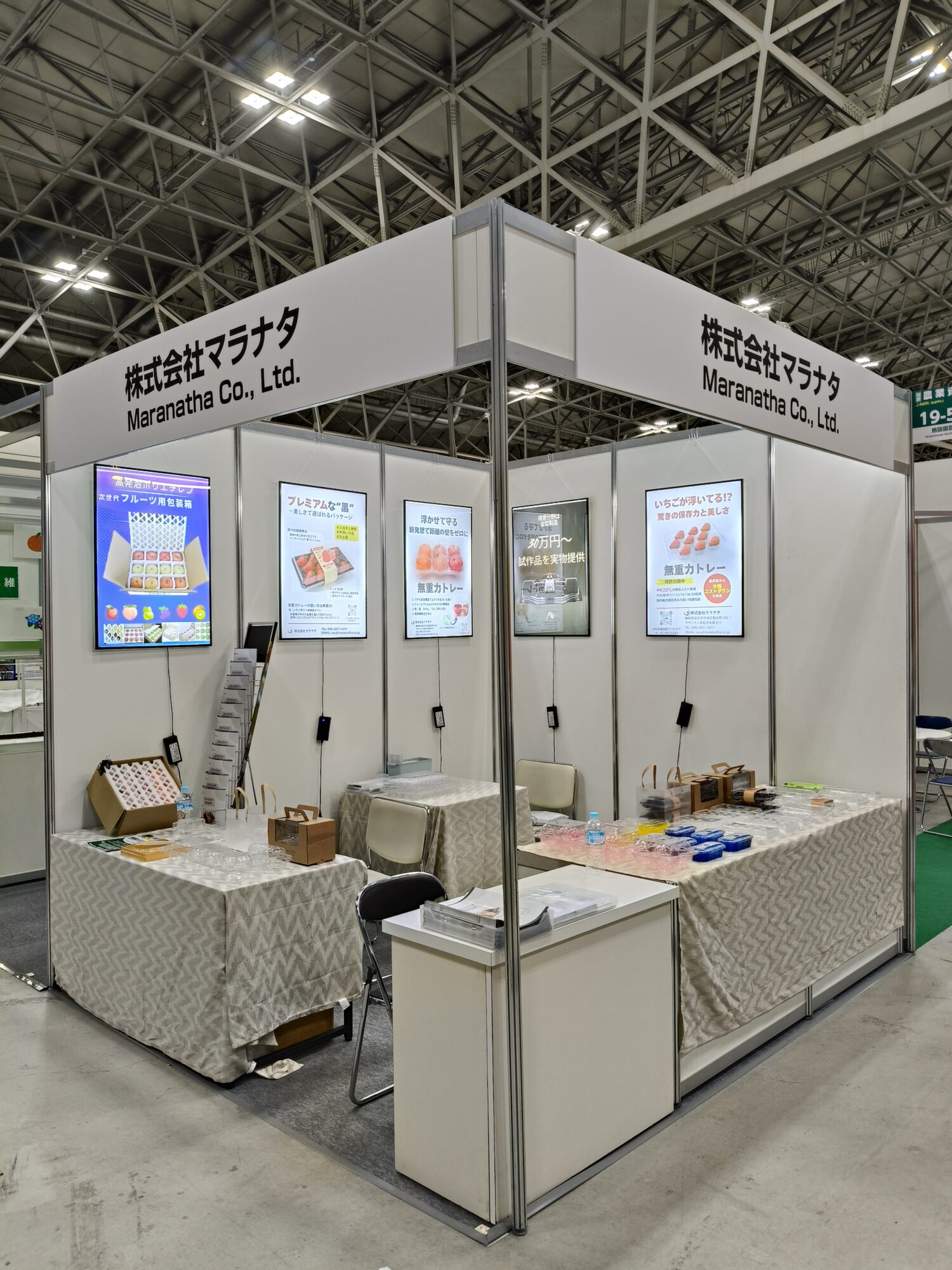 株式会社マラナタでは、いちご用パッケージをはじめ、さまざまな果物包装資材を展示いたしました。また、弊社オリジナル製品である「無重力トレー」も多くの方々にご注目いただきました。